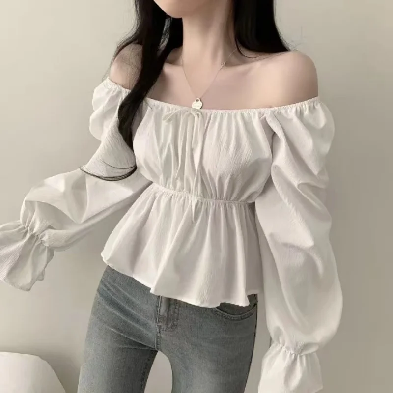 2025 Fashion New Ruffle White Long sleeved Women’s Blouses Square Neck Sexy Short Shirt Korean Style Flare Sleeve Sweet Tops