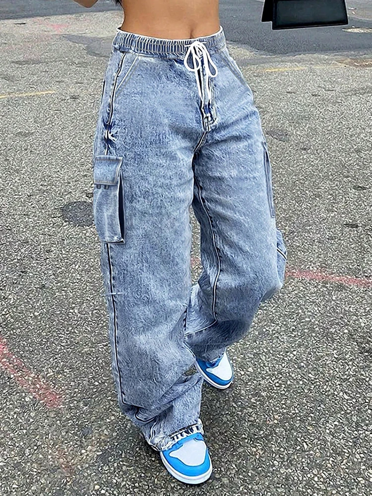 Women’s Denim Cargo Pants Loose Drawstring Elastic Waisted Pockets Casual Straight Wide Leg Trousers Women’s Clothing TC70235